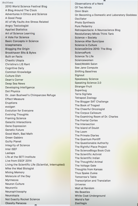 In the era when “science blogging” was emerging, a lot of writers were on the ScienceBlogs network. (That was long, long before I entertained the idea of blogging.) Now, word has recently come out that the ScienceBlogs network is shutting down, with a mere whimper. This is the end of an era, as many highly visible writers were early members of this site. If you just look at the list of archived blogs that used to be on the network, you might notice a bunch of sites that evolved into their own elsewhere, at first glance I see Myrmecos, Deep Sea News, Laelaps, and Not Exactly Rocket Science. Some authors have made outreach a huge part of their academic careers, and others have developed made a career of science communication.