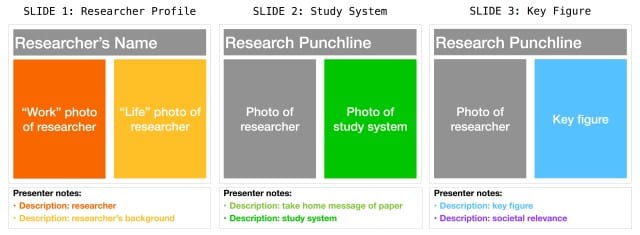 Figure 3: A schematic of the slides we build featuring biologists from underrepresented backgrounds. See the real deal at projectbiodiversify.org/examples