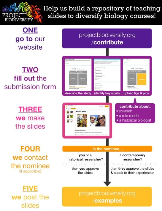 We are seeking submissions! Our goal is to build a rich repository of teaching slides based on research by biologists from all backgrounds that spans the introductory biology curriculum. This is a lofty goal, and is why we designed our repository to be a crowd-sourced one. To share your research and life experiences and become a role model, please consider submitting. Or, to support other role models, consider nominating the work of someone else (historical or contemporary)! Check out our infographic below to learn about the submission process (Figure 4).