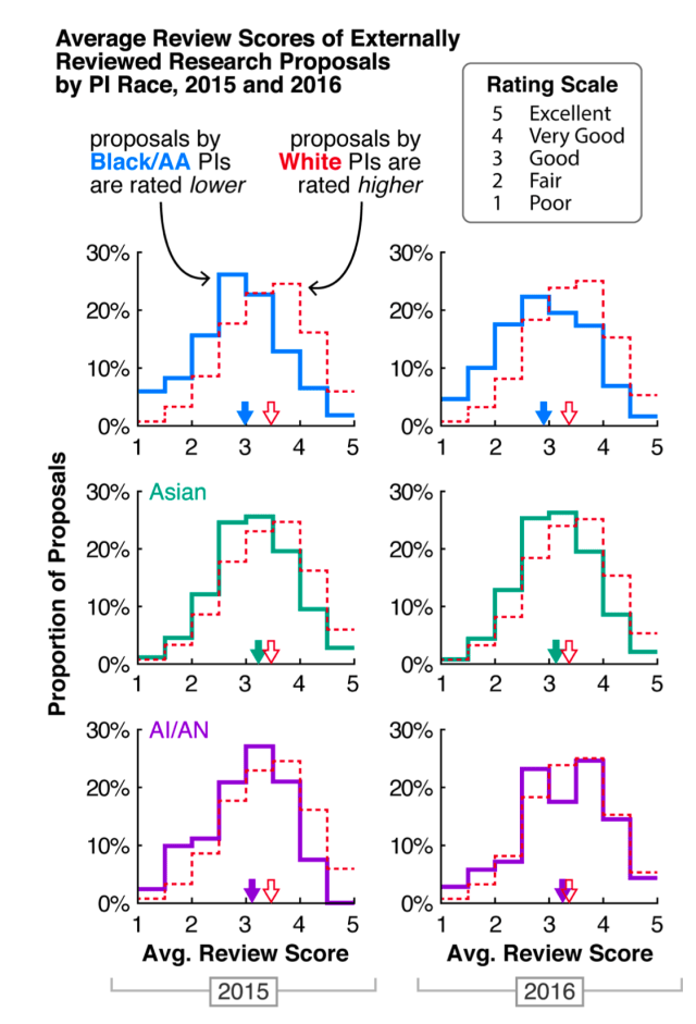 Using over 20 years of data on funding rates, they demonstrate that white PIs have been getting funded at higher rates than non-white PIs. It feels like the scope of this preprint is similar to what Ginther et al. documented for NIH in 2011. Since that time, the Ginther Gap has been central to discussions involving disparities at NIH.